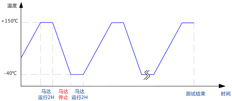 將磁性速度傳感器安裝在恒溫恒濕試驗箱密閉腔室內(nèi)的測試臺上,設(shè)定如下圖所示程序,實時監(jiān)控傳感器的各項性能參數(shù)。如此循環(huán)10次,共計耗時24天,傳感器在測試過程中無異常。